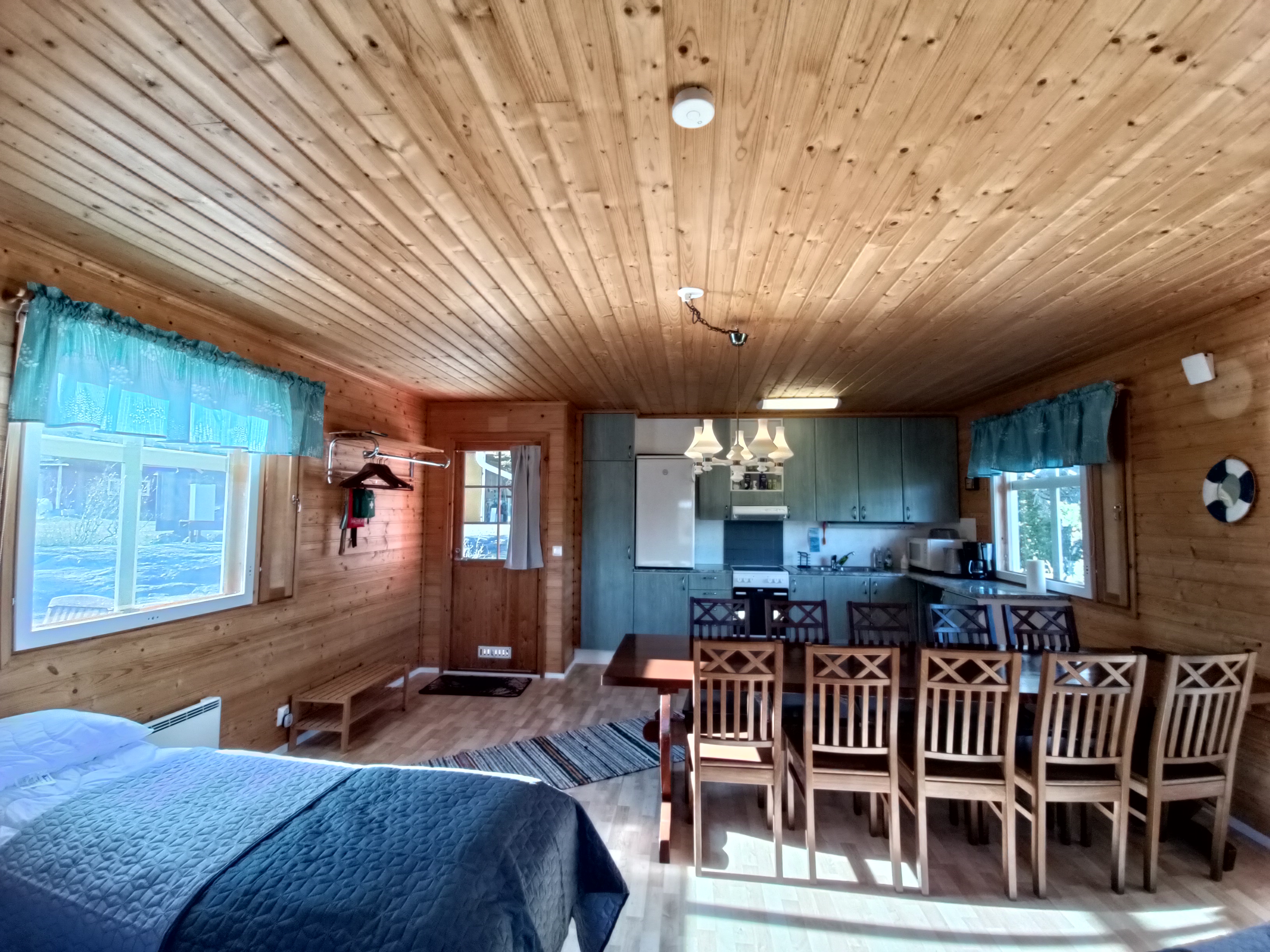 Mökit on varustettu perus keittiö- ja ruoanlaittovälineistöllä, sekä kahvin- ja vedenkeittimillä. Kaapeista löytyy kahvia ja teetä, paistoöljy, suola, pippuri, sokeri ja joitain kuivattuja yrttejä ja mausteita. Lisäksi mm. leivinpaperia, tuorekelmua ja foliota. Mökeissä on peitot ja tyynyt valmiina (sekä myös lisäpeittoja ja -tyynyjä), tarvitset vain omat liinavaatteet ja pyyhkeet mukaan. Ne voi myös tarvittaessa vuokrata lisähintaan.